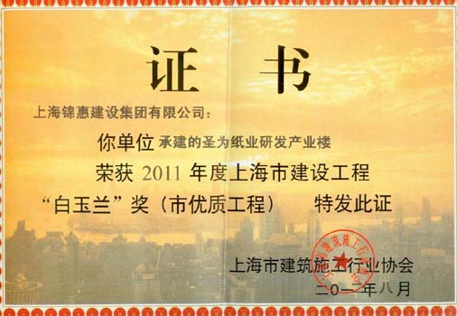 由錦惠集團承建的圣為紙業(yè)研發(fā)產(chǎn)業(yè)樓工程項目,經(jīng)過(guò)一冬一夏的時(shí)間考驗,無(wú)質(zhì)量問(wèn)題,經(jīng)上海市建筑施工行業(yè)協(xié)會(huì )確認后,于2012年8月1日榮獲2011年度上海市建設工程“白玉蘭”獎(市優(yōu)質(zhì)工程)。